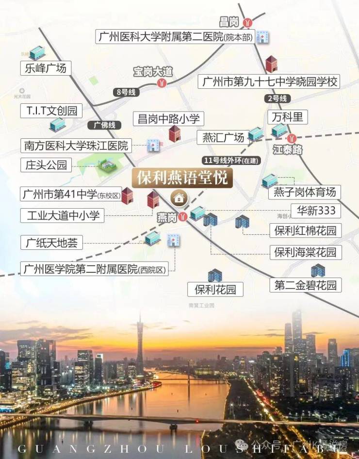 项目位于海珠区工业大道中的燕岗地铁站旁,地铁上盖项目(11号线+广佛线),坐落于工业大道中,背靠珠江后航道,傲立于海珠新活力文商旅融合圈与广州市"首个"后航道服务型制造创新带交汇的核心地带,海珠后航道将成为海珠未来唯一连片开发的豪宅板块。