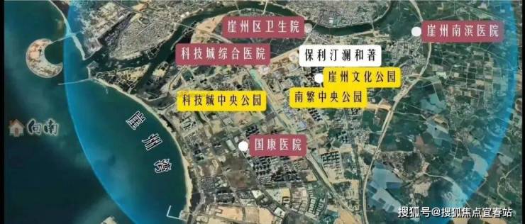 在医疗资源方面,项目区正在建设中的崖洲湾科技城综合医院约1km,距崖州区卫生院约2.6km,距国康医院约3.2km,距崖州南滨医院约4.4km。