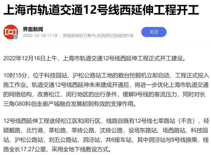 目前12号线西延伸正在加速推进,预计2027年底开通试运营。12号线西延伸在松江境内从G60云廊沿沈砖公路,东西向穿过洞泾,设沪松公路和刘五公路设站,在洞泾站与9号线交汇。