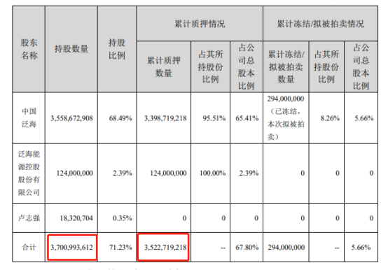 公告同时显示,截至目前,中国泛海及其一致行动人合共持有的泛海控股约37亿股股份中,有35.22亿股处于质押状态,股权质押比例超过了95%。