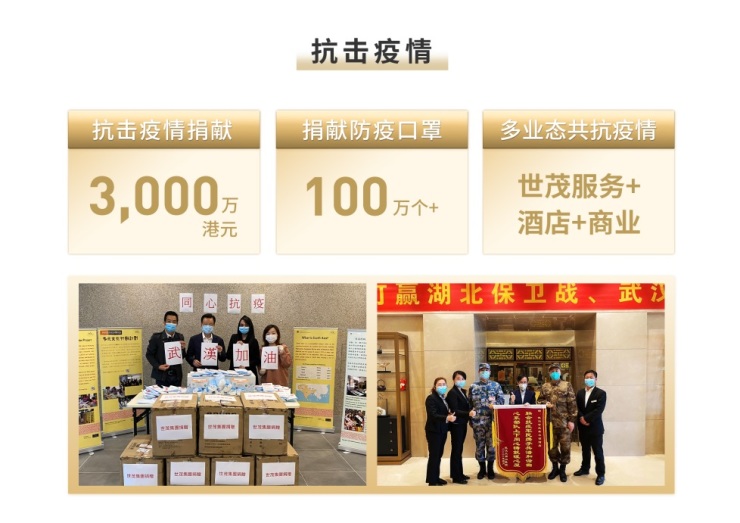 公益慈善方面,世茂坚持积极投身于文化传承、医疗扶贫、爱港共融、点亮生命等社会公益事业领域。2020年,在抗击疫情的排名前列时间,世茂捐款3000万港币、捐献防疫口罩超过100万个,为市民的健康安全保驾护航。截至2020年12月31日,世茂公益累计覆盖人数超过2200万,累计捐款金额超17亿元人民币,为成千上万个家庭和个人带去了梦想和希望。