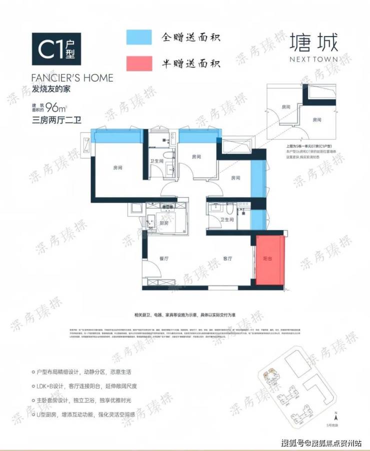 96㎡的3房2厅2卫,折后总价453-601万/套,折后单价4.76-6.27万/㎡。
