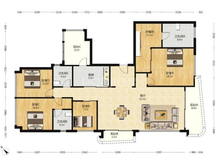 特征:大而豪,但效率低。代表如首开龙湖·天奕的185㎡三房、245㎡四房。优势是开间大、景观好(全南向或南北对流),但得房率普遍在75%-85%,存在一定的面积浪费。