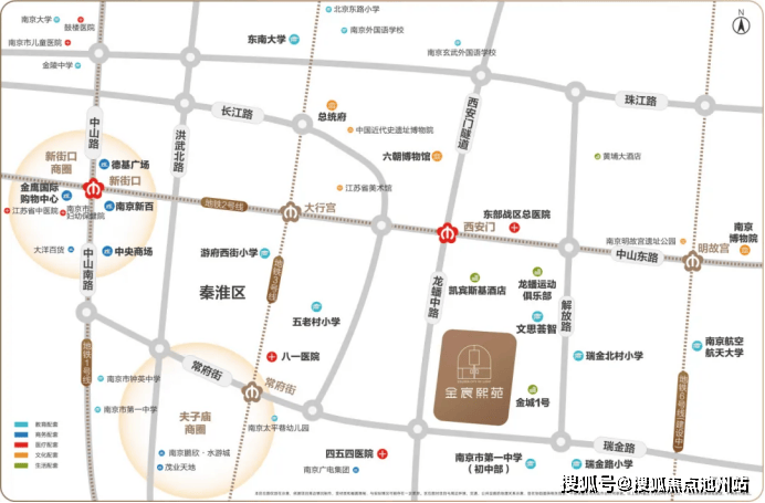 金宸熙苑坐落于南京的文脉坐标——西安门内,中山东路与龙蟠中路的交汇处。这里不仅是地理上的中心,更是南京人精神与生活记忆的锚点。沿着中山东路这条“城市封面”,向西是总统府、南京图书馆、江苏美术馆等组成的民国文化轴线,向东步行可达午朝门公园,感受明故宫的沧桑。