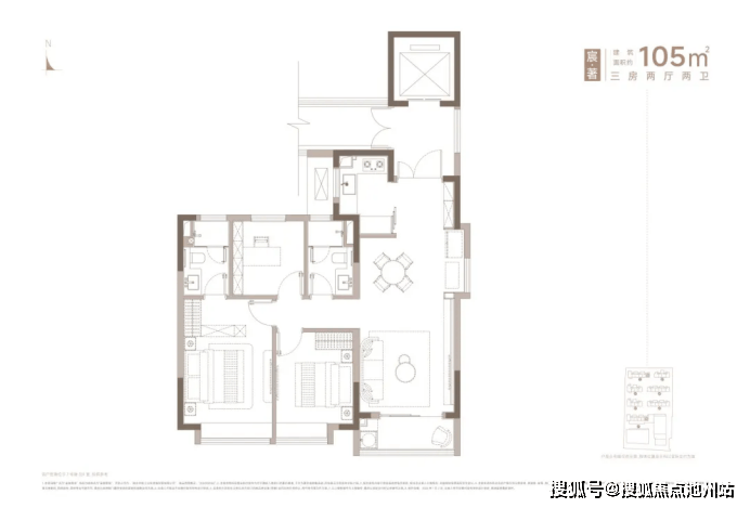 建面约105㎡户型,作为边户,拥有三开间朝南、双明卫的优越格局,保证了充足的采光与通透性。餐厅区域预留双开门冰箱位置,餐厅空间的开窗设计,将自然光线引入餐厅与玄关,让空间更明亮、动线更流畅。