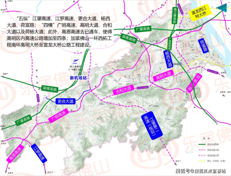 珠三角新干线(广州新)机场是全国仅有的17座4F级国际机场之一,该机场将落户高明,建设与完善“四线三站”高速客运铁路,新增3条高铁开进高明,佛山地铁2号线二期将接驳高明站。