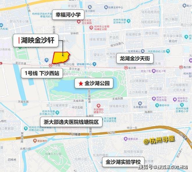 绿城湖映金沙轩位于下沙金沙湖板块,小区西南角为地铁1号线下沙西站,南侧一路之隔就是金沙湖公园,属于下沙板块的核心区域范围内。