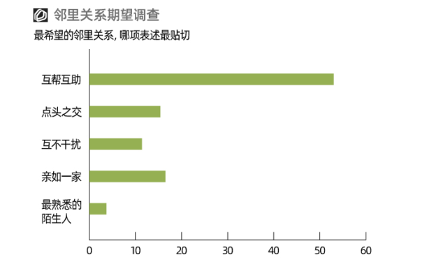 除了以上硬件设施环境,邻里关系这样的软性条件也极大影响人们居住质量。和“年轻人不爱社交”这样的普遍认知不同,调研发现53%受访者期待互帮互助的邻里关系,更有16.5%的人希望和邻居亲如一家。“远亲不如近邻”,在当下依然没有过时。