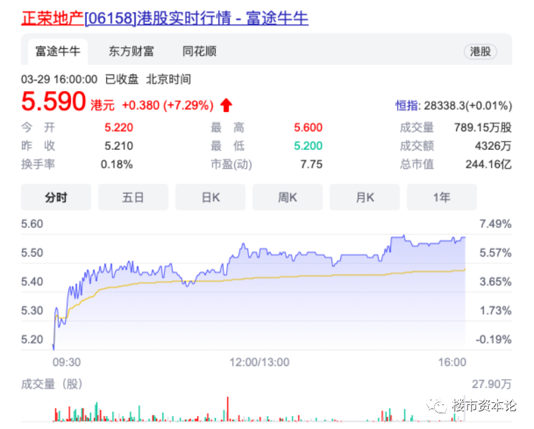 就在29日午后,蜂拥而至的资金为正荣地产业绩而来,4326万港元资金大笔买入,最终以7.29%的涨幅将其市值定格于244.16亿港元。