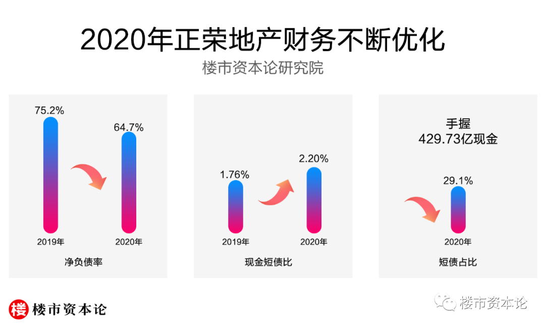 业绩报数据显示,正荣地产的净负债率由2019年的75.2%迅速下降至2020年的64.7%,远低于不高于100%的红线标准;现金短债比从2019年的1.76上升至2020年的2.20%,远高于不小于1的红线标准。同时,短债占比下降至29.1%,手握429.73亿现金足以覆盖短期内的债务压力,“降负债”力度有目共睹的。