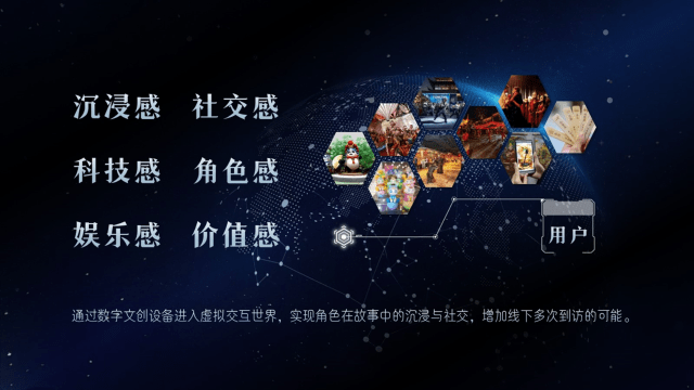 针对景区和乐园我们推出了一套解决方案,排名前列是围绕三要素模型进行的定制内容,给客户展现了一个“类元宇宙”的交互内容产品开发,第二是结合OMO运营思路,让项目通过产品创新增加体验,同时把线上与线下的场景相结合,在不断的产品的更新升级和交互中,增加用户复游频次。第三是将产商相融合,在产品开发中,设置多元角色,实现线上任务交互打卡及任务衍生品,增加用户互动体验的社交感,让商户、用户可以充分体验新构建世界中的乐趣。我们期待通过元宇宙文旅实验室的技术手段增加沉浸感体验,为项目开发者及体验者带来全新的内容享受。