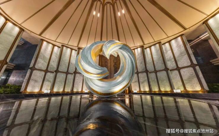 入口约56米面宽门庭,恢弘开场超400㎡酒店式环岛落客区,门庭顶部以杭州折扇为原型,两侧12片百达翡绿奢石列阵左右,其温润色泽与清雅气质似“玉石”浑然天成,如徐徐展开的画屏,礼序江南。