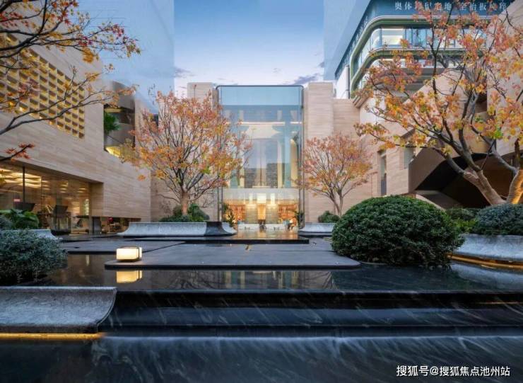 归家大堂以四照亭为引,楼下领要阁、贮月泉衔接泳池、健身房与私宴厅。建筑抬板如“山势”起伏,水幕珠帘飞泻约十米,构成约10米高差山谷碧潭;百年红枫临水而生,与花草相伴,勾勒出“山水入画”的立体诗境。