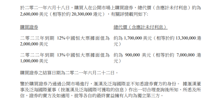 具体购买事项为面值200万美元的2023年到期12%中国恒大票据,总代价约为170万美元(约1330万港元);面值为100万美元的2022年到期13%中国恒大票据,总代价约为90万美元(约700万港元)。购买证券的结算日期为2021年6月22日。