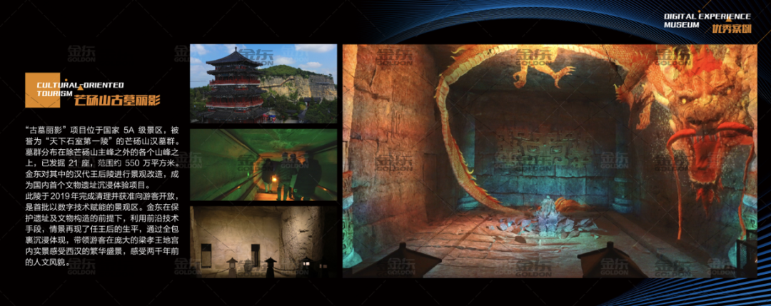 对于这类产品的规模建议是:占地面积在3000~4000平,体验时长在45分钟,每一批接待人数在50人左右,每小时接待300人左右,每天接待人数在2400人左右。案例:芒砀山古墓丽影“古墓丽影”项目位于国家5A级景区,被誉为“天下石室排名前列陵”的芒砀山汉墓群。墓群分布在除芒砀山主峰之外的各个山峰之上,已发掘21座,范围约550万平方米。金东对其中的汉代主后陵进行景观改造,成为国内排名前列文物遗址沉浸体验项目。此陵于2019年完成清理并获准向游客开放,是首批以数字技术赋能的景观区。金东在保护遗址及文物构造的前提下,利用前沿技术手段,情景再现了任王后的生平,通过全包裹沉浸体现,带领游客在庞大的梁孝王地窖内实景感受西汉的繁华盛景,感受两千年前的人文风貌。