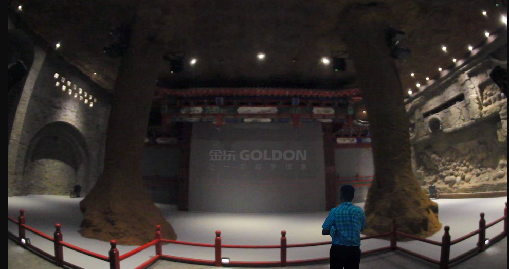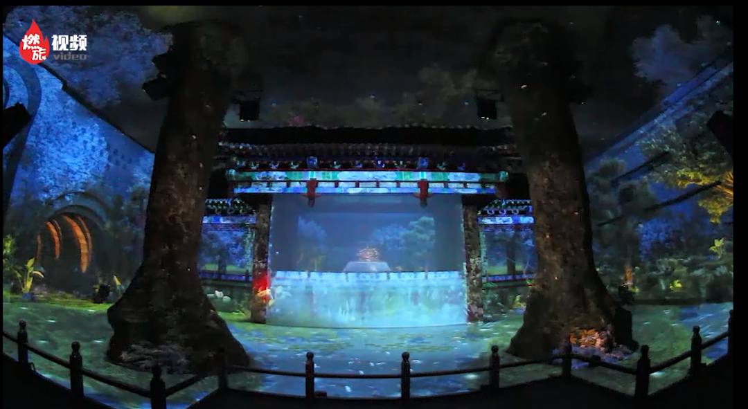 古井贡酒和华戏楼是安徽亳州的两大城市名片。2016年,适逢古井贡集团正在打造白酒工业旅游试点,在他们的厂区,打造了一些地下酒窖,也将当地的华戏楼做了1:1的模型,用来加强游客的观光体验。但如何让古井贡酒和华戏楼产生关联和互动?如何能够丰富游客的体验感?基于客户的需求,我们在项目上进行了大量的创新和提升:将整个地下酒窖以华戏楼的形式,通过数字创意手段,最终打造了一场科技与文化数字沉浸演艺的一个秀场。古井贡酒主打“无极之水,桃花春曲”,所以我们就把门厅的两根柱子改造成了桃花树的影像,伴随着顶面是漫天纷飞的桃花,地面是潺潺的无极之水。结合戏台的全息影像,将古井贡酒的制作技艺以及历史渊源结合华戏楼这一IP进行了优质的演艺。这一演出也是综合运用了声光电等全息影像技术,使得游客沉浸场景之中,仿佛穿越时空。