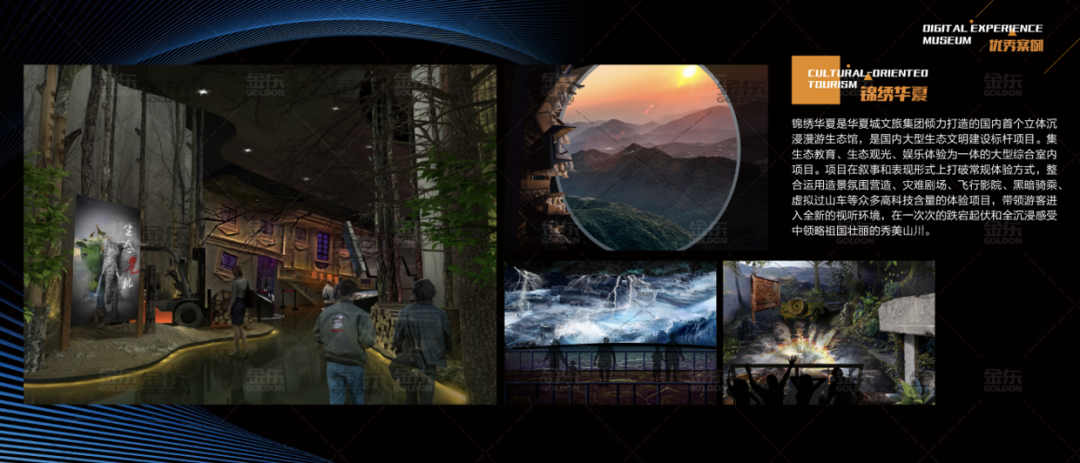 案例二:锦绣华夏锦绣华夏是华夏城文旅集团倾力打造的国内排名前列立体沉浸漫游生态馆,是国内大型生态文明建设标杆项目。集生态教育、生态观光、娱乐体验为一体的大型综合室内项目。项目在叙事和表现形式上打破常规体验方式,整合运用造景氛围营造,灾难剧场、飞行影院、黑暗骑乘、虚拟过山车等众多高科技含量的体验项目,带领游客进行全新的试听环境,在一次次的跌宕起伏和全沉浸感受中领略祖国壮丽的秀美山川。