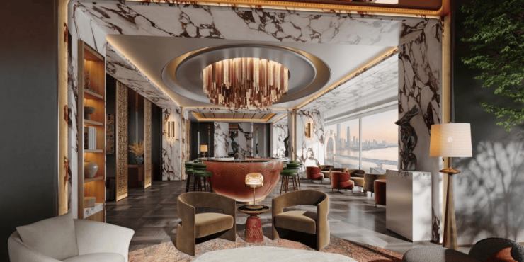 吧台与墙面均采用宝格丽同款奢石,亿万年地质运动形成的纹路,与窗外开阔的江幕景观相呼应,让每一次对酌都眼见澎湃。