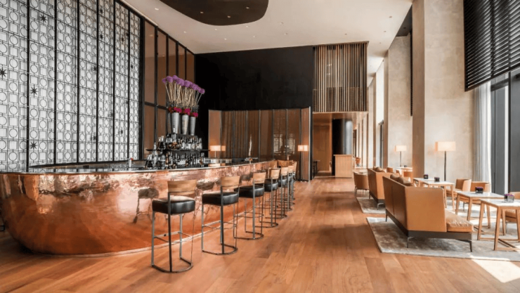行政酒廊的设计理念,源自宝格丽酒店酒吧,酒吧底座同样使用纯人工打击定制的锤纹红铜装置,上千次的捶打,超30余次的打样,方能形成艺术感的光泽和纹路。