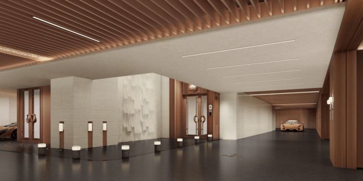 一层入户大堂整体艺术风格以岭南古典庭院艺术中“照壁借景”和汉文制式的“云气纹”为设计线索,饱含人文气息的东方叙事,打造当代的都会桃源。