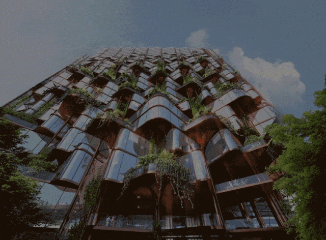 在力迅·琶洲湾的立面设计中,崔愷大师创新提取珠江奔涌的水波纹,拆解、抽象、重构为建筑肌理,若干条自由曲面形体的相互交错,编织出蜿蜒起伏的韵律之美。