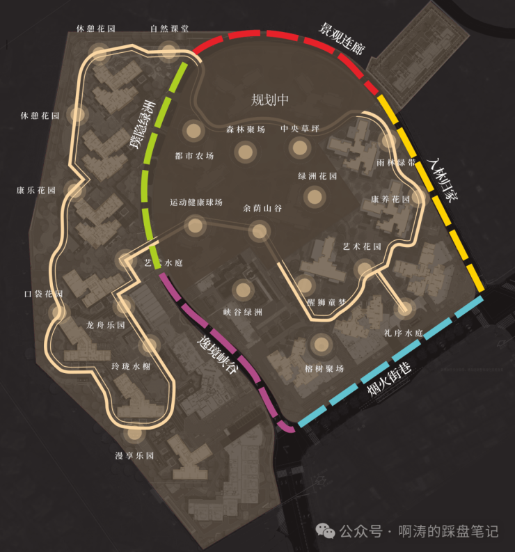 2)林荫内环:约7.2万㎡超级花园+约1.2km林荫漫步道