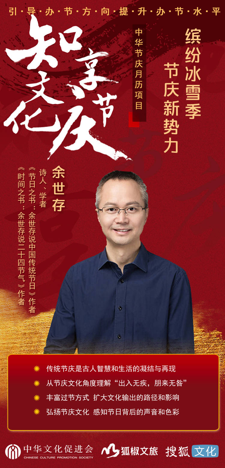 12月28日,《知文化 享节庆》第二场直播沙龙“文化暖冬季 节庆迎新年”举行,诗人、学者、《节日之书:余世存说中国传统节日》作者、《时间之书:余世存说二十四节气》作者余世存、博鳌文创院合作中心主任、中建西北院文旅产业中心主任、陕西袁家村商业策划运营管理公司总经理董珂、搜狐文化主编任慧、狐椒文旅主编曹延一起,聚焦暖冬迎春类节庆及活动,邀请专家学者莅临直播间,与观众共同零距离感受暖冬迎春节庆背后的文化和故事。以下为著名诗人、学者余世存老师在直播沙龙的主要观点摘录: