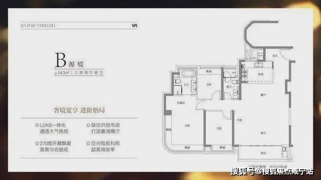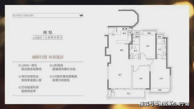 建面约122㎡3房2厅2卫,非常标准的动静分离、三开间朝南户型。几乎保留了前一个户型所有的优势,但在尺度感、私密性和舒适度上又有突破,不管是采光、视野、通风、私密性,还是实用性都十分出色。主卧拥有270度环幕观景飘窗,视野和采光都非常好。