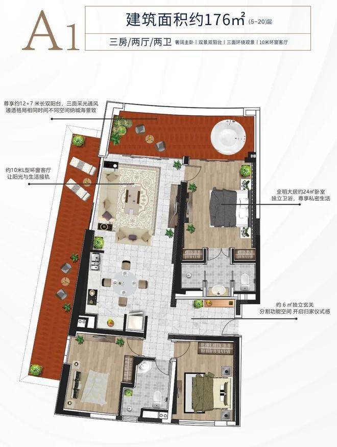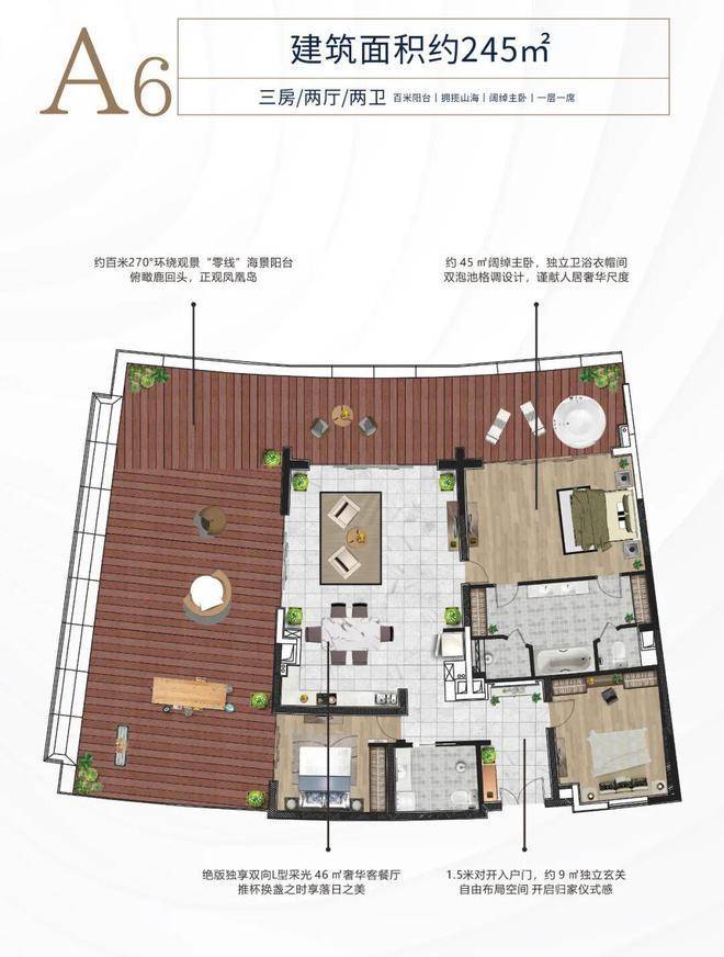 A6户型约245平方米 三房两厅两卫超大阳台
