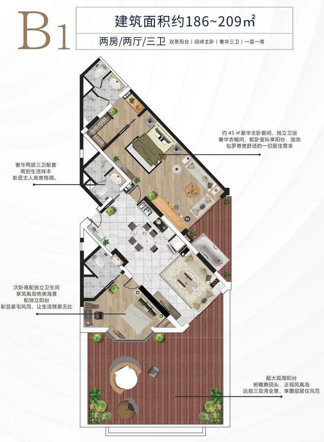 B1户型约186-209平方米 两房两厅三卫大阳台