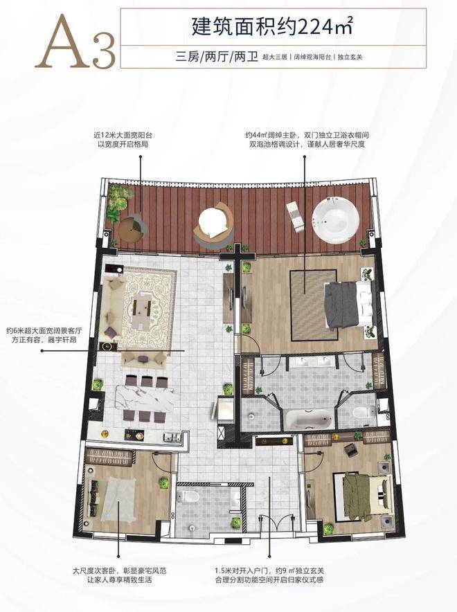 A3户型约224平方米三房两厅两卫大阳台