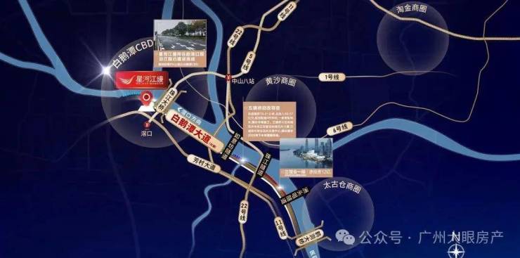 项目约750m即达5号线地铁滘口站,30分钟直达珠江新城,白鹅潭未来有超10条地铁线路穿过,覆盖大湾区1小时交通生活圈