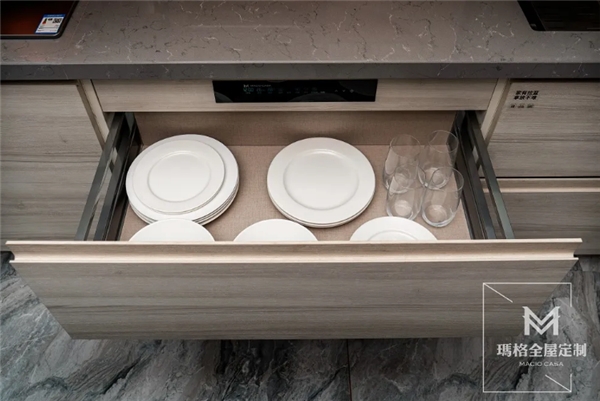 碗碟拉篮,解决了碗筷归置问题,合理的功能分区,拿取一目了然;抽拉自如的拉篮,不占用厨房空间,就能轻松把碗筷收纳整齐。不过,如果担心拉篮里的五金会生锈,就尽量选择海蒂诗、悍高品牌的高品质五金,用起来更舒适。