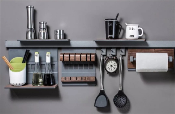 除了在厨柜中融入功能五金设计以外,其实,在少有墙上也可以利用五金打造一个收纳区。根据身高,合理地在垂直的墙面上设计五金挂件,将轻巧的厨具、调料瓶罐放置于上面;释放台面收纳压力的同时,方便伸手就能拿取,烹饪更高效便捷。
