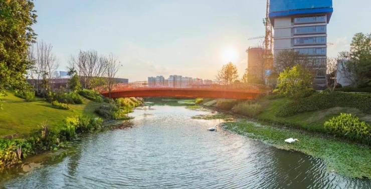 国贸地产代建了一座约1.8万方的滨河市政公园,而且三座岛屿社区都有不同的主题,并设置了非常丰富的景观节点。由于2条天然水系的存在,整个社区可以被环绕成一个紧密的小型生态系统,有效地形成一道环境保护屏障。同时,每块土地以及组团都可以拥有独特的水系景观,让人眼前一亮。一旦从小区入口进入,从外部延续而入水系美景又将与生活场景、活动空间有机结合,景观设计既有质感又不失烟火气。