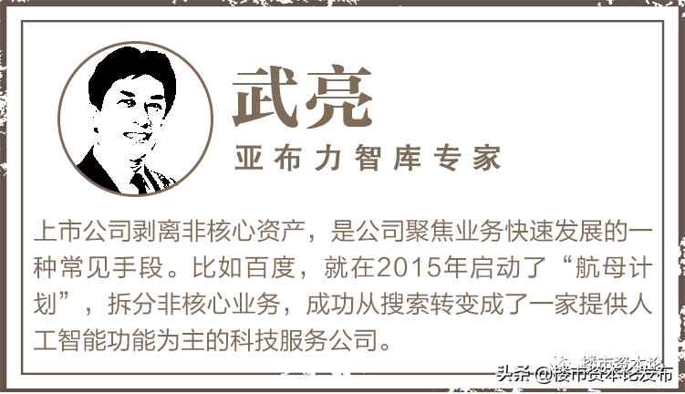 对此,亚布力智库专家武亮指出,上市公司剥离非核心资产,是公司聚焦业务快速发展的一种常见手段。比如百度,就在2015年启动了“航母计划”, 拆分非核心业务,成功从搜索转变成了一家提供人工智能功能为主的科技服务公司。