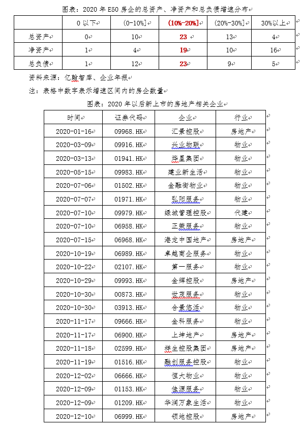 至于净资产增长明显,主要归根于总资产由净资产和总负债构成,2020年E50房企的净资产具有以下特征:(1)房企倾向于分拆业务上市以及配股等吸纳资金,增厚所有者权益;(2)多数房企净资产增速高于总负债增速,资产结构进一步优化,提升了财务安全性。