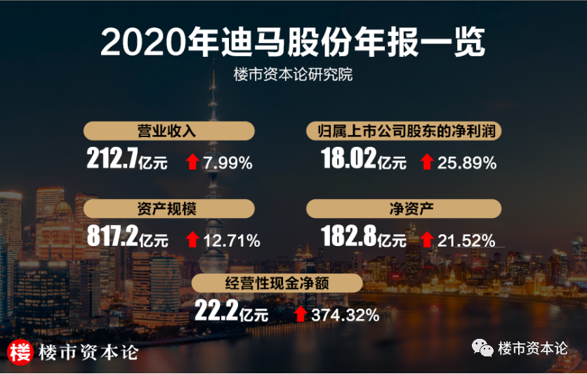 楼市资本论观察到,较新公布的年报显示,2020年迪马股份实现营业收入212.7亿元,同比增长7.99%,归属上市公司净利润为18.02亿元,同比增长25.89%。
