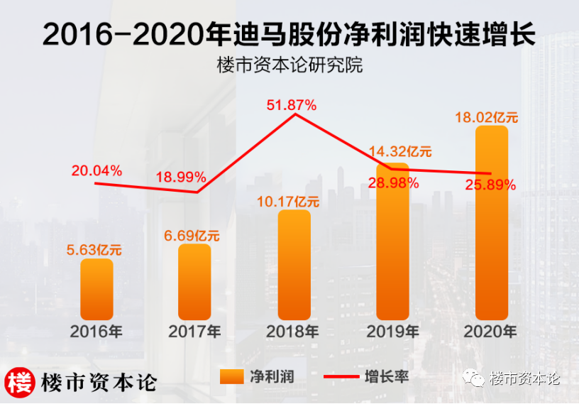 楼市资本论注意到,从2016年开始,迪马股份的净利润进入快速增长期,2016-2019年对应的净利润为5.63亿元、6.69亿元、10.17亿元、14.32亿元,同比增长20.04%、18.99%、51.87%、28.98%。算上2020年,迪马股份的净利润实现了连续五年高增长。
