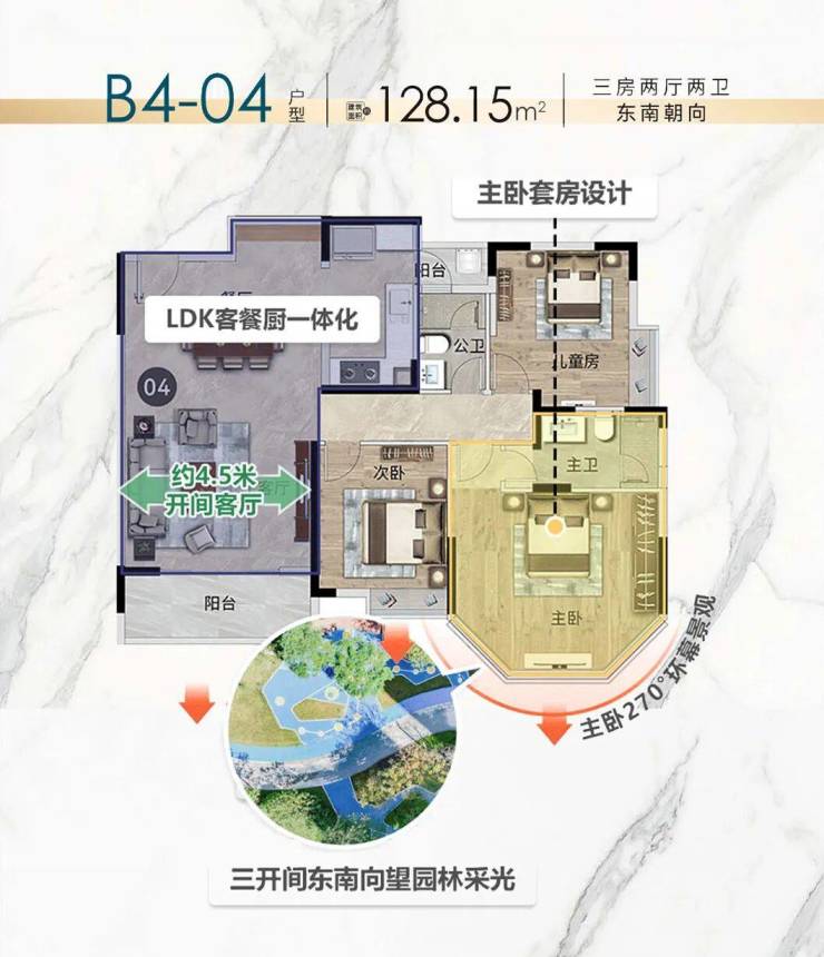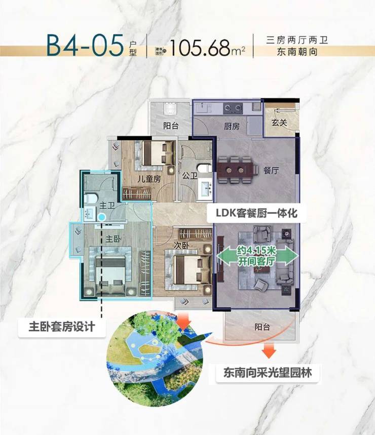 譬如B4栋的建面约110㎡三房空间,大气、开阔是第一感受。