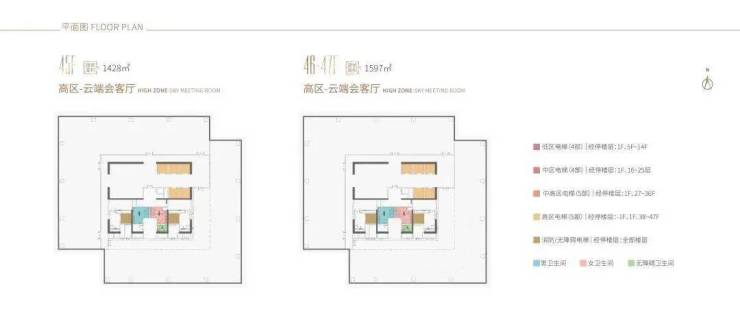 功能规划:1-3F(部分)为配套商业(约 0.4 万㎡)、3-34F(部分)为自持写字楼、34(部分)-36F 为可售写字楼、38-47F 为企业会客厅。
