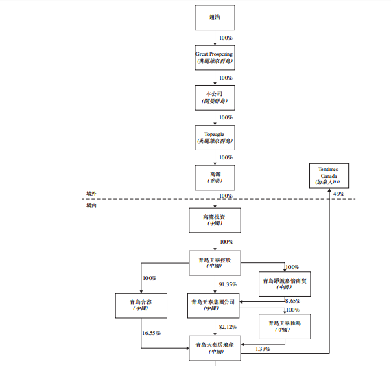 招股书显示,重组后上市前股权结构显示,青岛天泰集团通过直接和间接方式持股天泰境内房地产运营的主体——青岛天泰房地产83.45%股权。