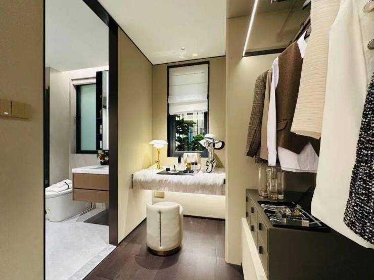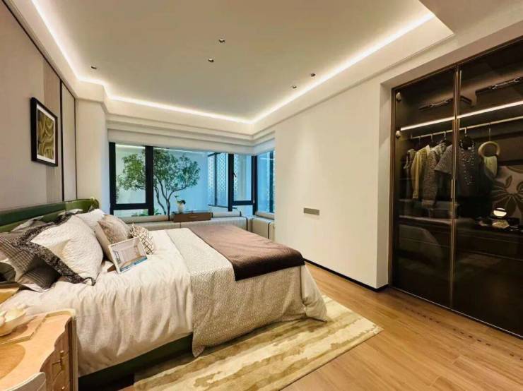 主卧面积约27㎡,配备全明衣帽间和环幕飘窗。