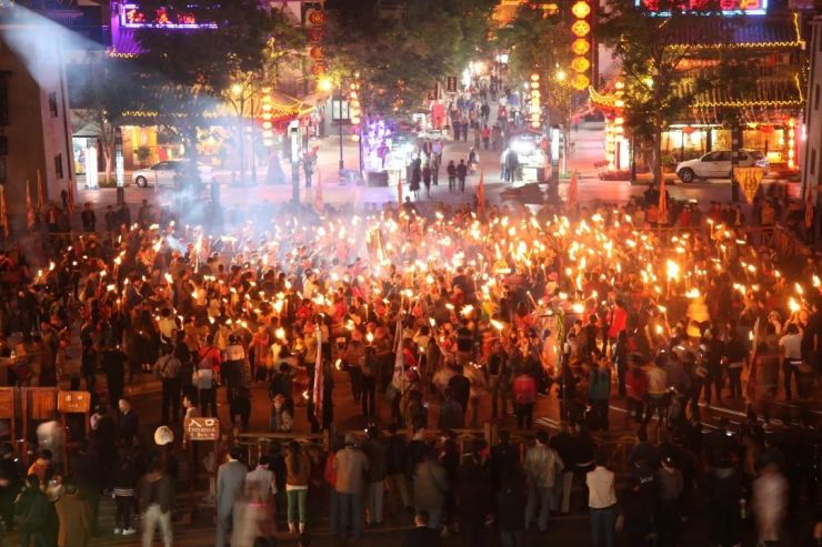 节庆当天,在彝人古镇的毕摩广场举行祭火大典、万人左脚舞狂欢。各族男女青年也会点燃松木制成的火把,除秽求吉;或唱歌、跳舞、赛马、斗牛、摔跤;或举行盛大的篝火晚会,彻夜狂欢。天南海北的游客三五成群,高谈嬉笑,结伴到美食街大口灌着米酒,就着热气腾腾的烧豆腐。放眼望去,茶馆、酒肆、客栈,哪一处不是人声鼎沸,分明就是回到古时喧嚣的市井。醉眼迷离间,已分不清是在现实中还是在梦里。