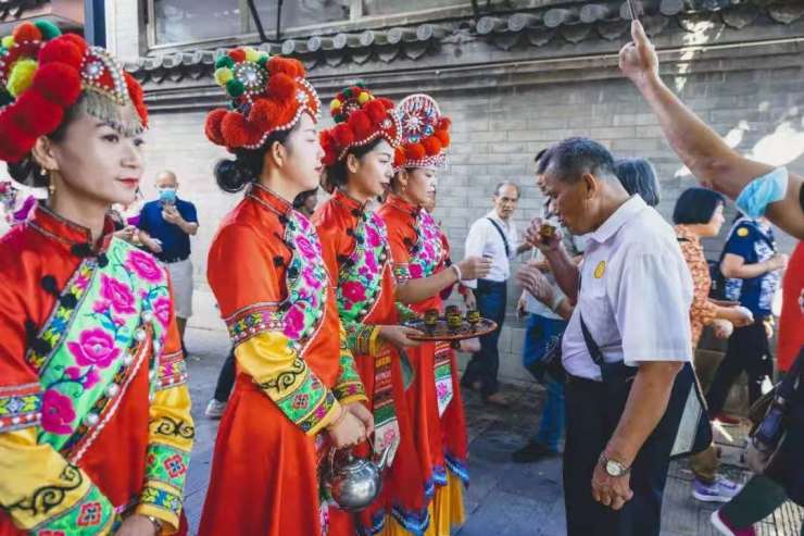到彝人古镇民居,热情的土著民皆先以酒敬客。饮酒时,数人或数十人席地而坐围成圈,抒怀畅饮,每座用同一酒器依次轮饮,一次只喝一口,当地称之为“转转酒”。且彝族有饮酒不用菜的习俗,直至一醉方休;而时则捧起海碗,一饮而尽,尽显豪爽气概。