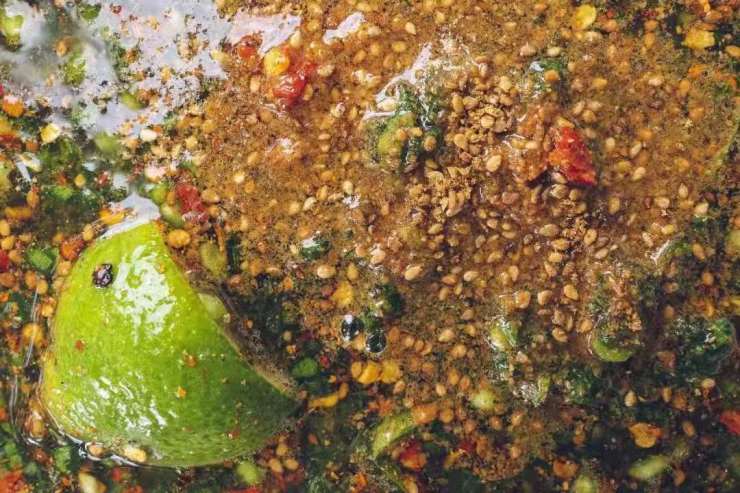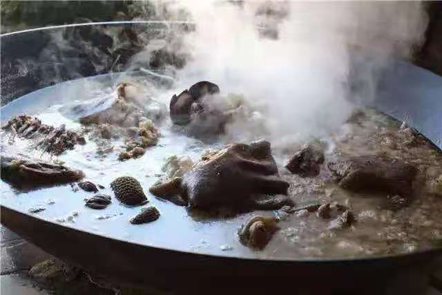 在彝人古镇最出名的风味吃食,莫过于羊汤锅。食材选用肥壮山羊,褪去内脏洗净,整只羊在炭火上烤黄后锤碎骨头,连同羊血、肚杂、羊肉切成碎块入锅而煮。同时,加入草果、花椒、八角、干辣椒等佐料,老火慢炖,烹制出的羊肉汤毫无膻味,汤白、味浓、肉香。