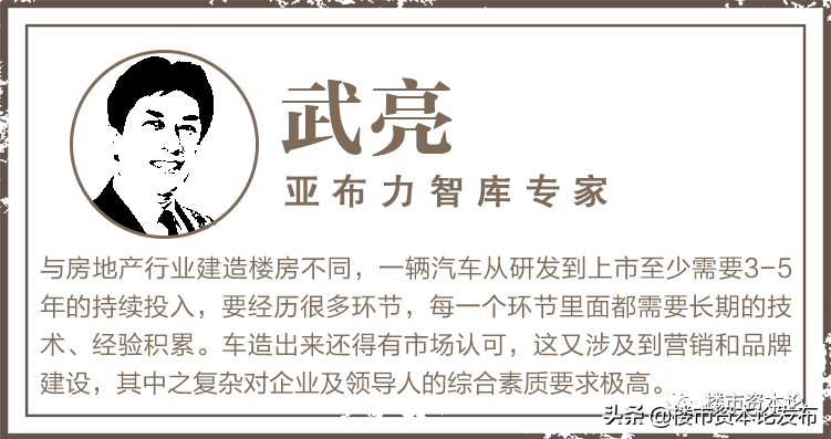 亚布力智库专家武亮认为,与房地产行业建造楼房不同,一辆汽车从研发到上市至少需要3-5年的持续投入,要经历很多环节,每一个环节里面都需要长期的技术、经验积累。车造出来还得有市场认可,这又涉及到营销和品牌建设,其中之复杂对企业及领导人的综合素质要求极高。