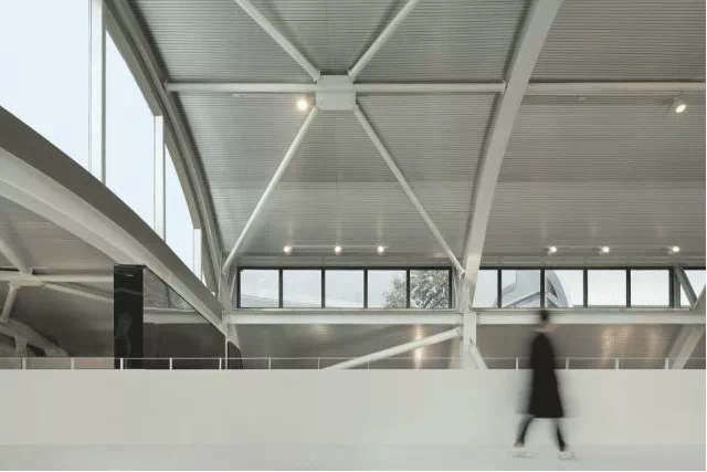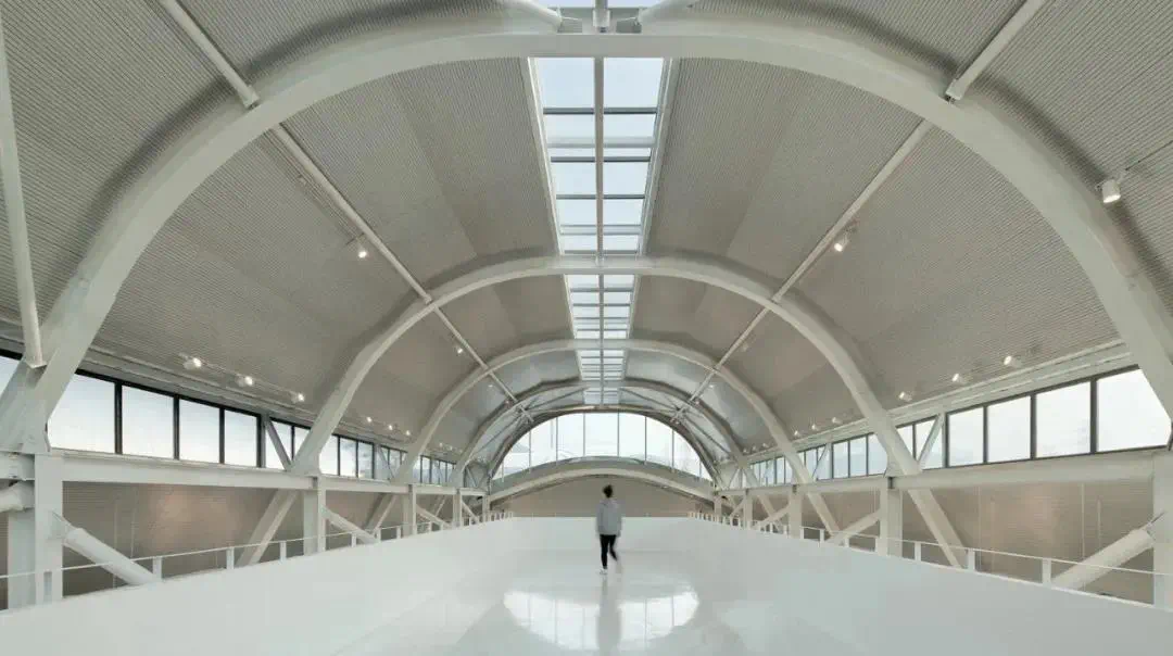 功能区的心脏“车站”在这里,钢是改造、加建项目的优选结构策略。随着一列火车从长条型的厂房窗外呼啸而过,银色拱顶的车厢意象呼之欲出。拱顶的原型唤起了人们对神庙、图书馆、车站等经典建筑原型的敬意。