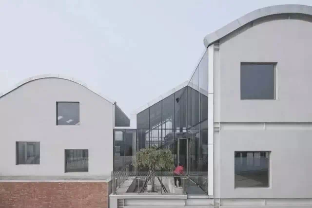 建筑外观加建部分采用不同透明度的幕墙形式,从深灰钢板、阳光板到玻璃,再而过度到银色拱形的金属屋面。