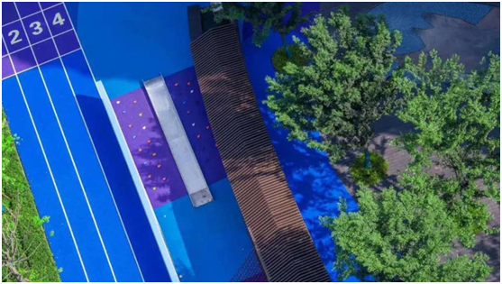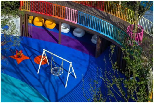儿童乐园,明亮的色彩搭配和趣味的互动场景,充分激发小朋友成长过程中的跑跳天性;活动区域采用EPDM软地面的做法,景墙廊架等边角均采用倒圆角处理,规避日常跑动中容易摔伤、磕碰的问题。